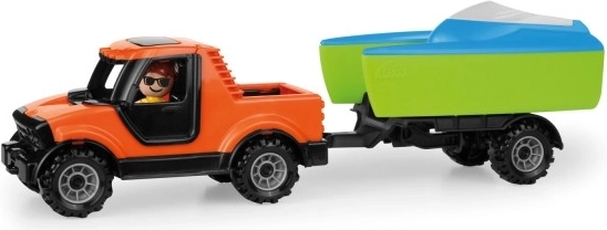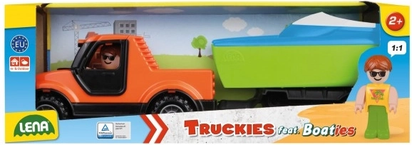 Set distractiv pentru micii șoferi: pickup cu remorcă și bărcuță de la Lena, realizat din plastic de calitate, rezistent, complet funcțional mecanic și cu cabina rabatabilă și figurina activă. Jucărie ideală pentru copii de la 2 ani, produsă în siguranță în Cehia.