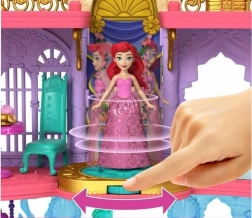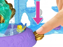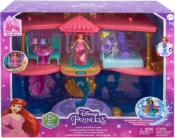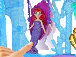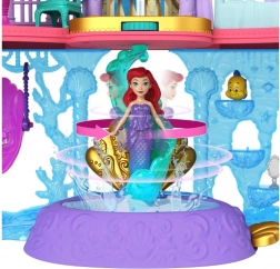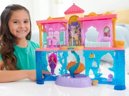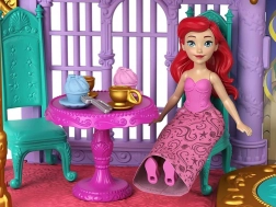 Descoperă lumea fermecată a Prințesei Disney Ariel cu palatul pe două niveluri, care conectează regatul terestru și cel submarin. Copiii se vor bucura de 6 zone de joacă, ring de dans rotativ, sală de mese, dormitor și o piscină subacvatică cu buton pentru bule. Setul include păpușa Ariel cu schimbare de look – rochie roz și coadă care își schimbă culoarea în apă caldă – pentru povești nesfârșite și joacă creativă.