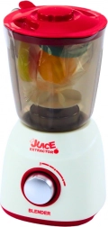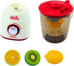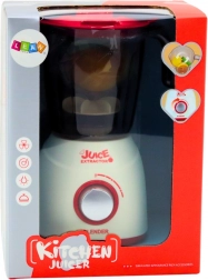 Mixer realist pentru copii, în alb-roșu, cu efecte luminoase și sonore, lame din plastic care se rotesc și 3 bucăți de fructe pentru un joc de bucătărie și mai distractiv. Dezvoltă motricitatea fină, coordonarea și imaginația copiilor. Alimentare cu 3× AA (nu sunt incluse).