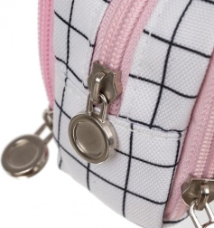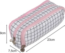 Penar stilat și practic cu trei compartimente separate cu fermoar, care asigură ordine perfectă în rechizitele școlare și de birou. Țesătura rezistentă Oxford 600D în culoare albă, cu grilaj negru și fermoare roz, oferă un aspect elegant și modern. Datorită organizării inteligente cu bucle elastice și buzunare, este ideal pentru școală, birou și călătorii, putând servi și ca trusă cosmetică.
