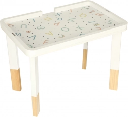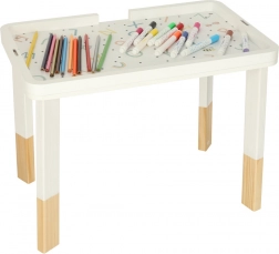 Măsuța este realizată din lemn de calitate, cu margini rotunjite, și este finisată cu vopsele netoxice. Respectă normele europene de siguranță (CE). Datorită blatului practic, o puteți folosi cu ușurință și ca spațiu pentru scris, desen și activități creative.