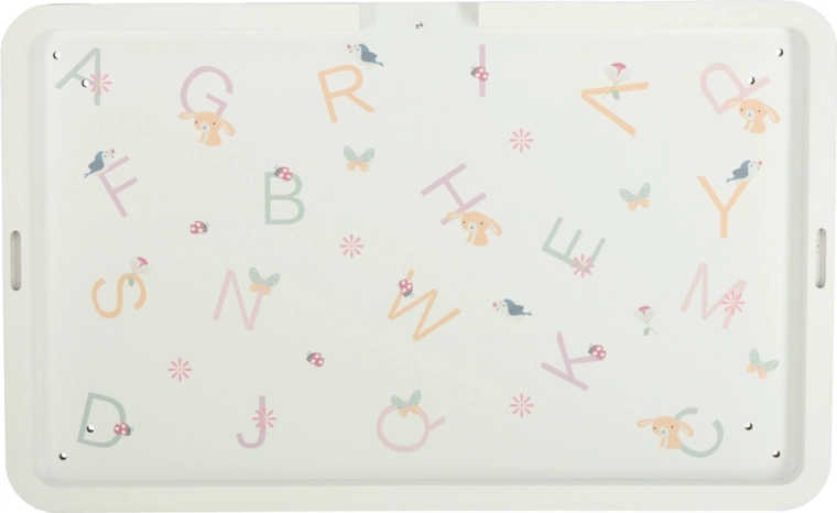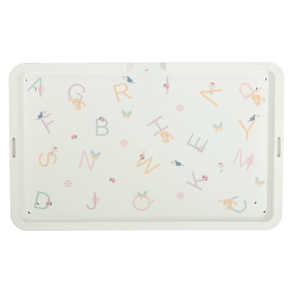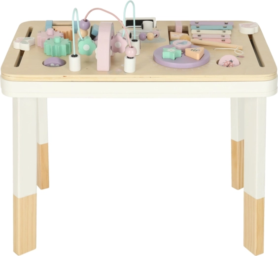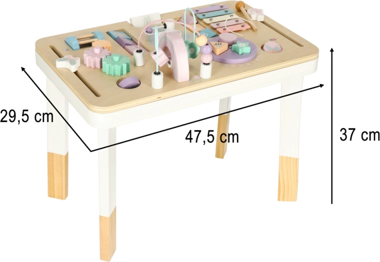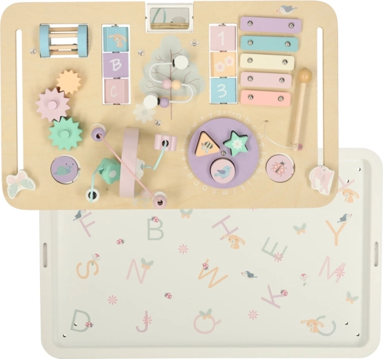 Pe blat găsești țambal/xilofon cu baghetă, labirint cu mărgele, elemente rotative și glisante și sortator de forme. Aceste activități dezvoltă îndemânarea manuală, concentrarea și reprezentarea spațială, în timp ce lemnul și culorile delicate susțin un joc liniștit.