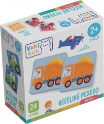 Descoperiți pexeso-ul cu mijloace de transport de la KukiKuk, distractiv și educativ. Setul conține 24 de carduri mari de 11 × 11 cm din carton solid de 2 mm, ideale pentru mâinile copiilor mici. Jocul dezvoltă memoria, atenția și vocabularul și include sfaturi pentru părinți și cadre didactice cu activități și variante de joc. Fabricat în Cehia, recomandat copiilor de 2–6 ani.