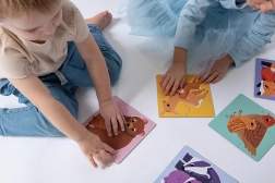 Urs, vulpe, bursuc, mistreț, căprioară și păsărel pe fundaluri colorate invită la asamblare și la povești despre natură și viața animalelor.