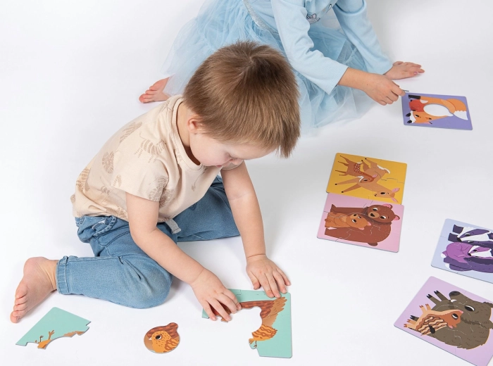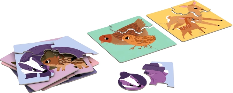 Acest set conține șase puzzle-uri pătrate cu ilustrații ale familiilor de animale – urs, vulpe, bursuc, mistreț, căprioară și păsărel. Fiecare motiv este alcătuit din patru piese mari, cu dimensiunea finală de aproximativ 15,5 × 15,5 cm. Formele identice ale încuietorilor de îmbinare îi îndeamnă pe copii la testare sistematică și potrivire corectă, piesele centrale ale puiilor având aceeași formă la toate motivele.