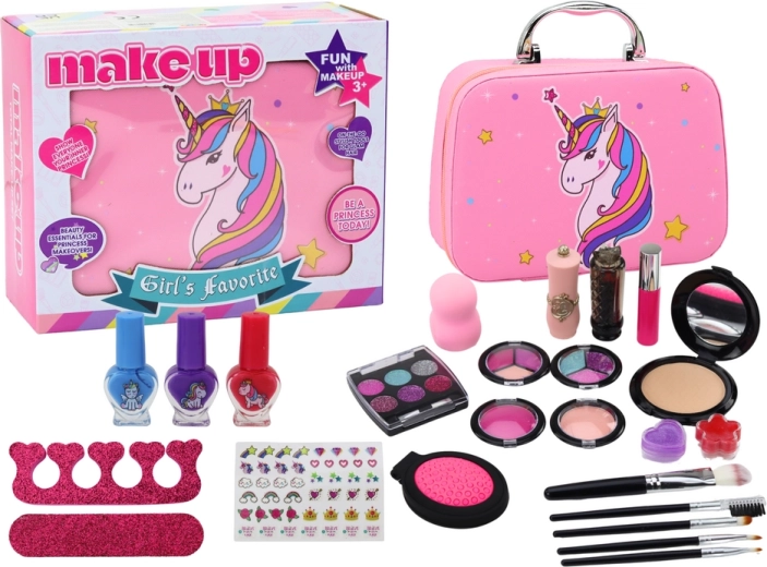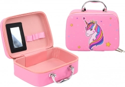 Acest set de frumusețe unic va transporta copilul tău într-o lume magică a machiajului! Cufărul roz cu temă de unicorn adorabil conține tot ce îi trebuie unei tinere artiste pentru a experimenta creativ cu look-ul ei.