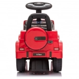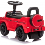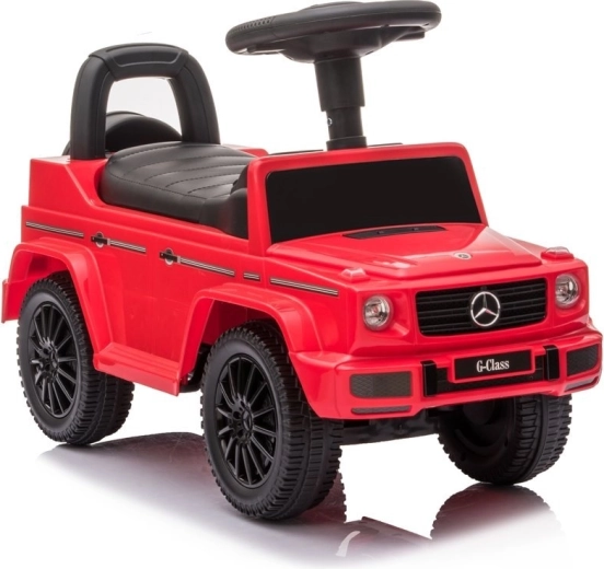 Trotinetă fără pedale pentru copii MERCEDES G‑Class în culoare roșu intens, din plastic rezistent, oferă aspect realist, șea confortabilă din piele ecologică și spătar sigur. Copilul se propulsează cu piciorușele, antrenându-și echilibrul și coordonarea, bucurându-se de sunetele claxonului și ale pornirii motorului. Sub șa se află un spațiu de depozitare pentru mărunțișuri; roțile din față sunt directoare pentru manevrare ușoară.