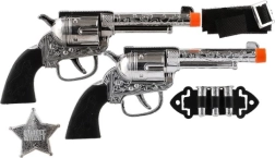 Devino un adevărat cowboy! Acest set distractiv pentru micii pistolari conține 2 pistoale din plastic de 19 cm, tocuri pentru curea și insignă de șerif, inclusiv alte accesorii pentru un joc autentic. Ideal pentru carnaval, costumații și aventuri acasă. Construcție sigură cu vârfuri portocalii și potrivit pentru copii de la 3 ani.