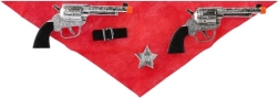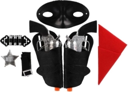Două pistoale cu tocuri, insignă de șerif, mască, eșarfă roșie și curea cu cataramă – tot ce-ți trebuie pentru un costum de cowboy perfect și un joc realist.
