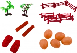 Copăcei, garduri și alte elemente din plastic ajută la crearea unei lumi preistorice proprii și dezvoltă jocul de rol.