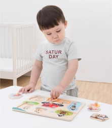 Puzzle-ul conține opt bucăți, fiecare având propriul său loc și mâner pentru o prindere ușoară. Sub fiecare bucată este o imagine care ajută copiii să găsească locul potrivit.