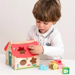 Această căsuță de sortare a formelor este o jucărie ideală pentru copiii de la 12 luni. Căsuța conține opt forme diferite, pe care copiii învață să le recunoască și să le introducă în găurile corecte. După finalizarea sarcinii, copiii pot recupera formele deschizând acoperișul.