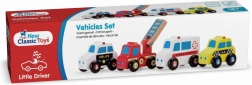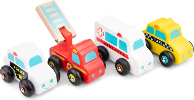 Acest set include patru vehicule din lemn colorate și rezistente: mașina de poliție, mașina de pompieri, ambulanța și taxiul. Joaca cu aceste vehicule ajută la dezvoltarea motricității grosiere și a imaginației. Fiecare vehicul este proiectat să fie sigur și amuzant pentru cei mici.