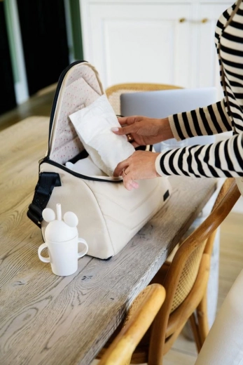 Geanta pentru înfășat este o soluție practică pentru părinții activi, în care pot fi puse scutece, șervețele și alte accesorii necesare. Când geanta este desfăcută, puteți, în plus, să vă schimbați cu ușurință copilul pe ea.