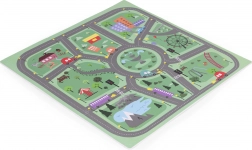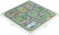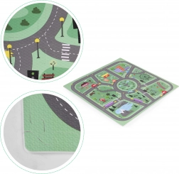 Motivul detaliat cu drumuri, intersecții și elemente urbane îi inspiră pe copii să inventeze povești, să conducă mașinuțe și să-și dezvolte imaginația și motricitatea fină.