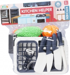 Descoperiți distracția în bucătărie cu acest set adorabil de bucătărie pentru copii! Acest set include nu doar o chiuvetă și un suport pentru vase pentru un joc realist, ci și diverse ustensile de bucătărie, cum ar fi trei cuțite, un ascuțitor de cuțite și un tocător. În plus, setul include un decojitor și câteva bucăți de alimente precum morcov tăiat, porumb și dovleac, care permit un joc realist.