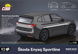 Setul de construcție Skoda Enyaq Sportline este un model redus la scară 1:35, care reprodusează fidel formele caracteristice ale vehiculului original Škoda Enyaq iV. Are roți rotative cu pneuri, care sunt ideale pentru mișcare în timpul jocului. Acest model va încânta nu doar copiii, ci și adulții fani ai seturilor de construcție, colecționarii și pasionații auto.