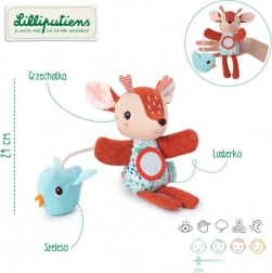 Păpușa de mână drăgălașă căprioara din colecția Stella de la Lilliputiens este o jucărie moale pentru primele povești, îmbrățișări și liniștire. Datorită orificiilor din lăbuțe se manevrează ușor, are clopoțel în căpșor, oglindă moale pe burtică și o păsărică foșnitoare pe șnur. Susține motricitatea fină, coordonarea mână-ochi și dezvoltă simțurile. Potrivită de la 6 luni.