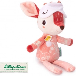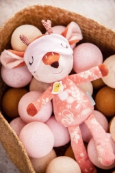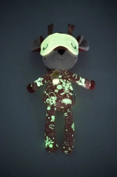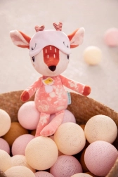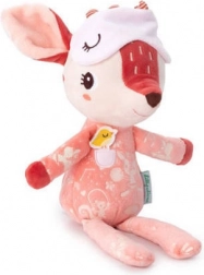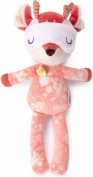 Căprioara Stella, în nuanță de roz cărămiziu, poartă o pijama drăgălașă cu buzunărel și aplicație cu păsărică, care sprijină percepția tactilă și vizuală. Masca pentru ochi poate fi trasă peste ochi și, după stingerea luminii, strălucește în întuneric, inducând o senzație de siguranță și confort înainte de somn. Jucăria este realizată cu grijă, moale și blândă cu pielea sensibilă a copiilor.