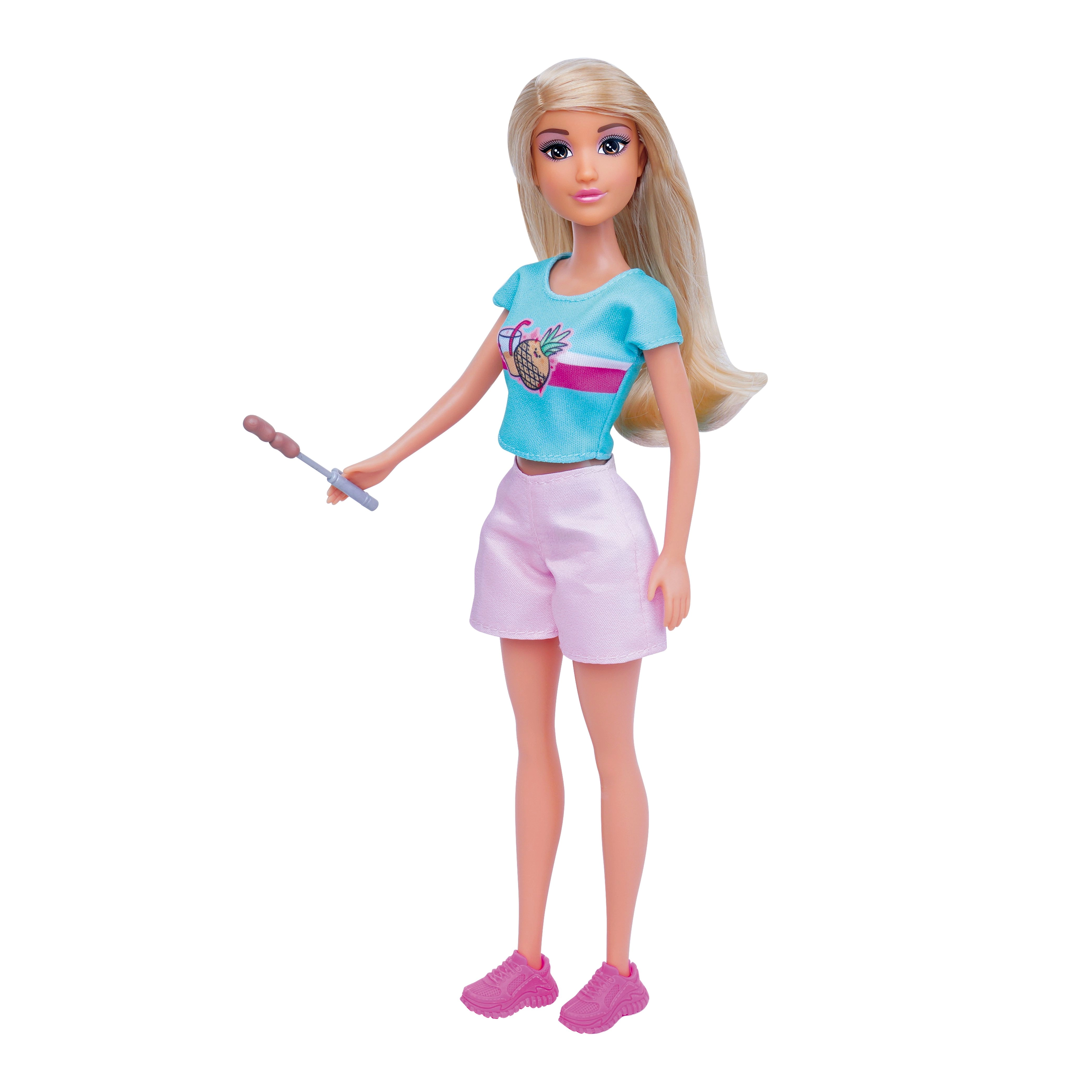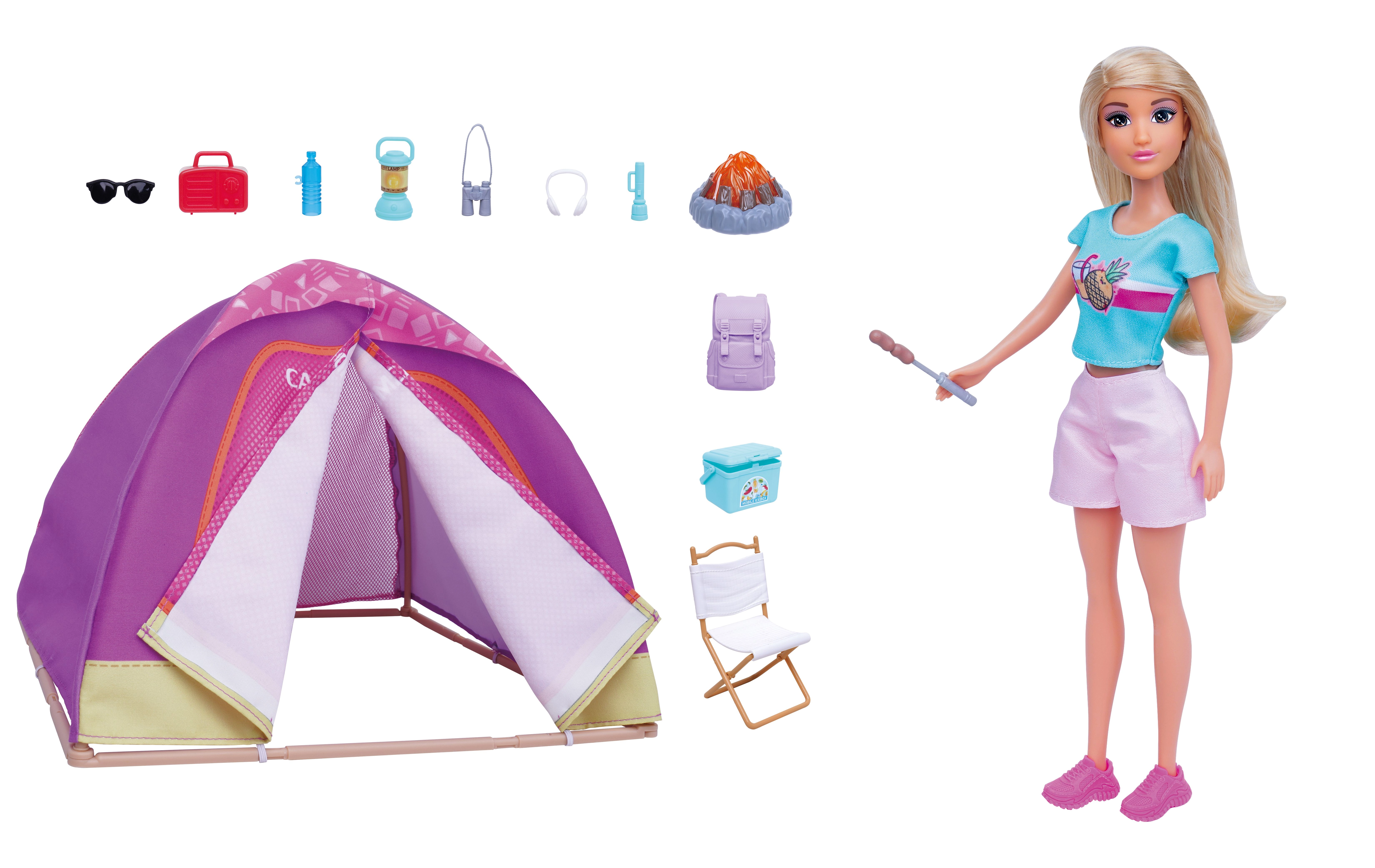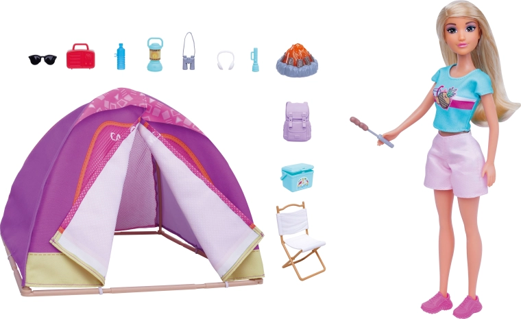 Acest set de camping cu păpușă oferă copiilor multe posibilități de joc – de la montarea cortului și pregătirea taberei până la friptul la foc cu efect luminos. Păpușa are haine și accesorii detașabile, se ține ușor în mână și este ideală pentru joc individual sau în grup.