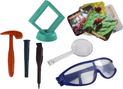 Setul include: bloc turnat, ciocan, daltă, perie, ochelari de protecție, lupă, pungă pentru descoperiri, suport de expunere și 6 carduri cu imagini și descrieri ale insectelor în limba engleză.