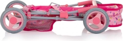 Capotina reglabilă protejează păpușa, iar coșul inferior găzduiește accesorii, biberonul și jucăriile preferate.