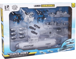 Acest set atrăgător oferă o aventură navală completă într-un singur pachet. Submarinul principal, cu lungimea de 28 cm, este echipat cu un lansator funcțional de torpile și cu propulsie pe bază de volant pentru un joc dinamic. Flota este completată de un portavion, o navă de luptă, un crucișător de luptă și trei avioane de vânătoare cu roți libere.