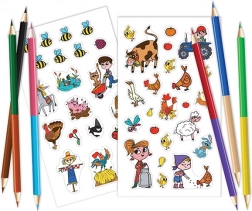 În pachet sunt incluse 2 foi de autocolante și 6 creioane colorate cu două capete, astfel încât copilul poate crea imediat și fără echipament suplimentar. O soluție practică pentru vacanță, pentru mașină, tren și săli de așteptare.