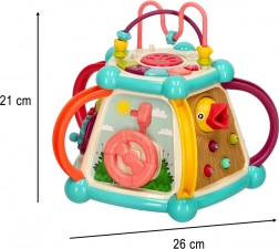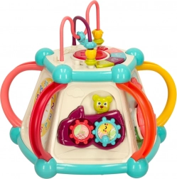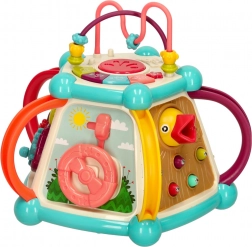 Pianul, volanul și rotițele care se învârt încurajează creativitatea și imaginația și, în același timp, dezvoltă îndemânarea degetelor. Fiecare latură a cubului oferă o activitate nouă.