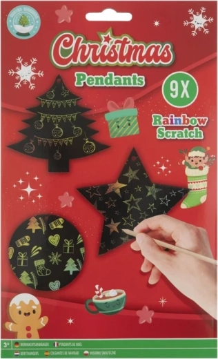 Setul conține 9 decorațiuni de Crăciun în trei forme, un răzuitor din lemn și un șnur colorat pentru agățare ușoară. Fiecare ornament are pe spate o parte tipărită și în față un strat răzuibil sub care se ascunde un finish curcubeu strălucitor. Activitatea este rapidă, curată și potrivită atât pentru copii, cât și pentru adulți.