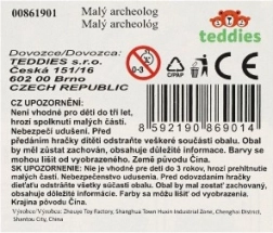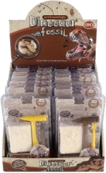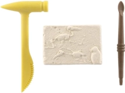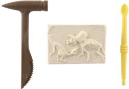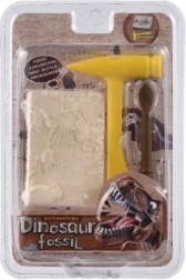În pachet găsiți un bloc cu imprimare de schelet de dinozaur și unelte necesare pentru excavații - ciocan și daltă din plastic.