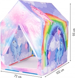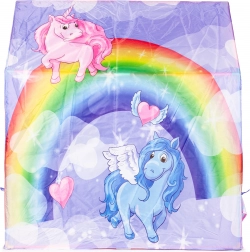 Creați copiilor un refugiu propriu pentru imaginație și distracție. Cortul de joacă IPLAY, cu motiv de curcubeu și unicorni, oferă un loc confortabil și intim pentru citit, joacă și odihnă. Datorită construcției ușoare și stabile, îl puteți amplasa cu ușurință în living, în camera copilului sau pe terasă.