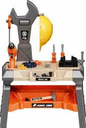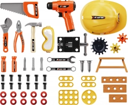 - Echipare bogată: măsuță, menghină, cască, fierăstrău, 2 șurubelnițe, ciocan, cheie reglabilă, clește combinat, 2 chei fixe, ochelari de protecție, taburet, roți dințate, șuruburi, piulițe, dibluri și bețe din lemn.