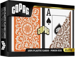 Setul de cărți de joc COPAG Elite în culorile portocaliu și maro este alegerea ideală pentru pasionații de poker. Fabricate din PVC rezistent, aceste cărți sunt create să reziste ani de utilizare fără deteriorare.