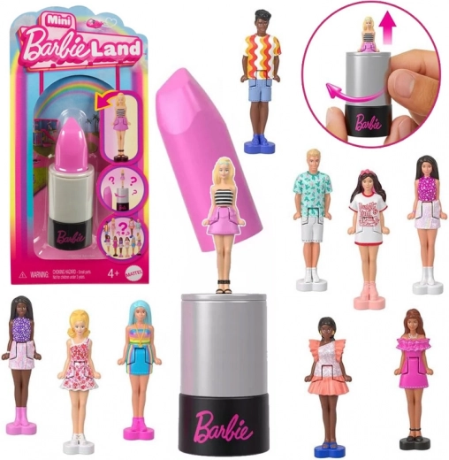 Un mecanism de rotire unic în partea de jos a rujului dezvăluie figurina în câteva clipe. Păpușile se îndoaie în talie și se expun ușor pe suport. Colecția include stiluri diferite și personaje – de la sport la ținută de seară – pentru și mai multă distracție și combinare cu seturile MINI BARBIE LAND (se vând separat).