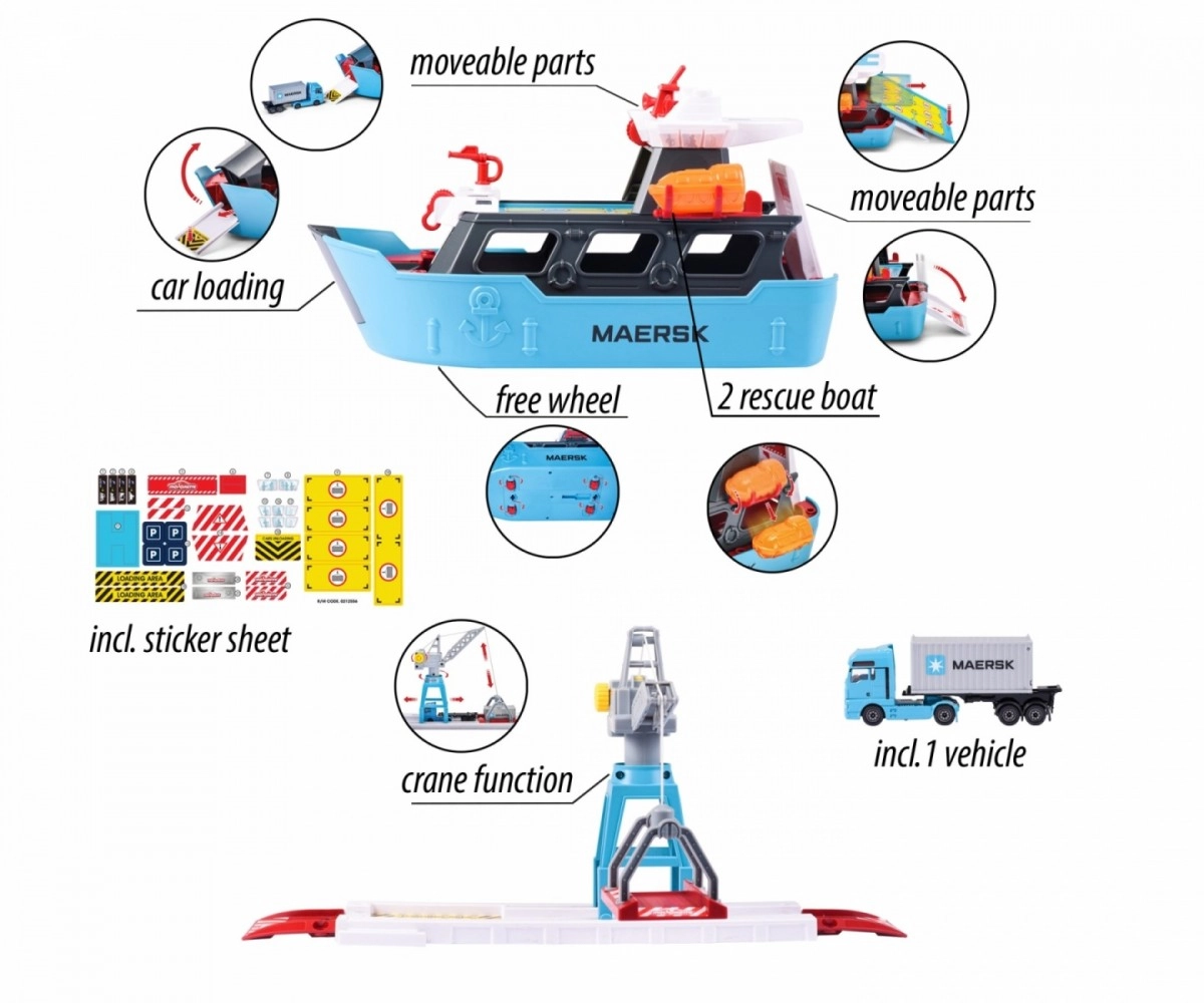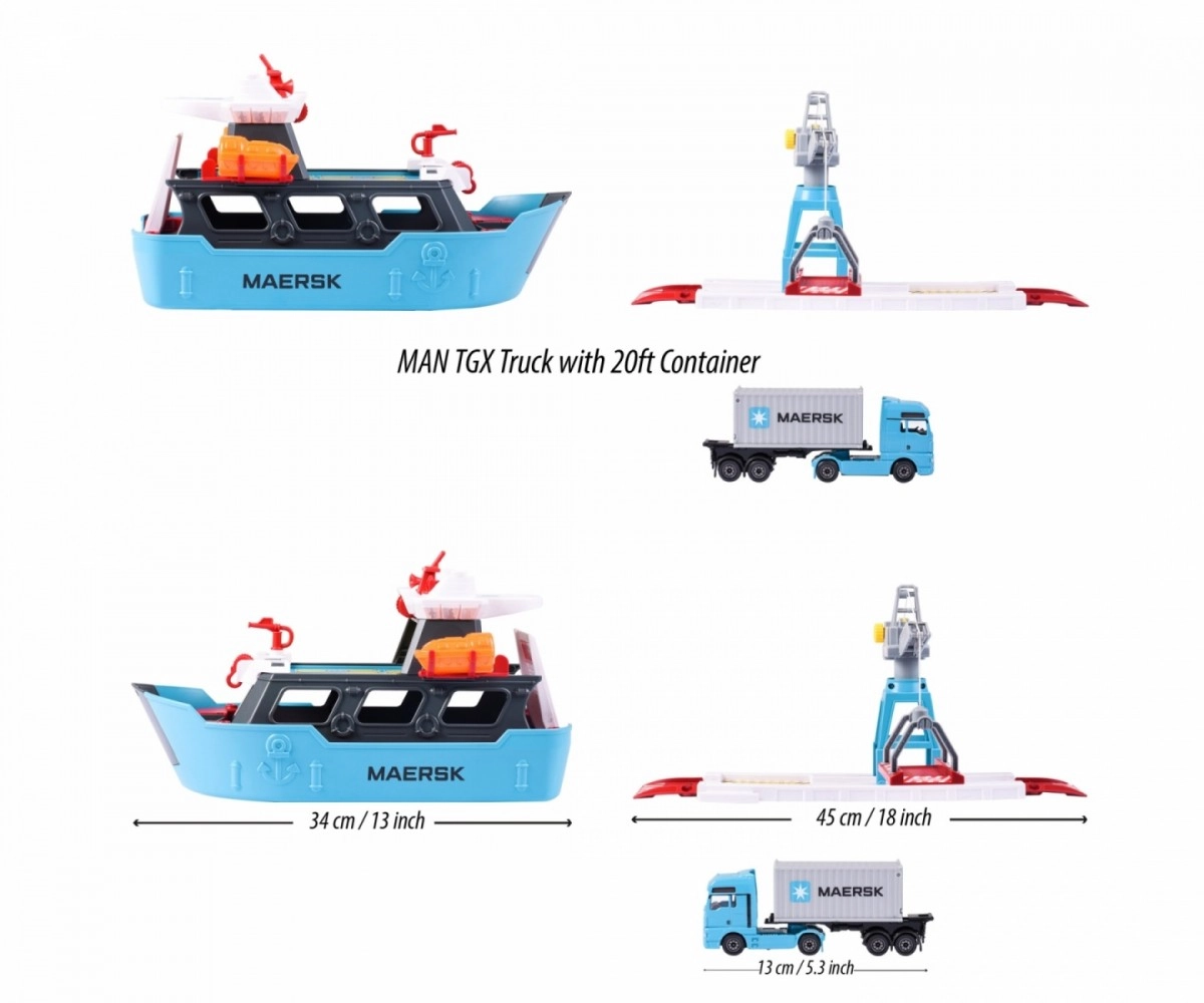 - Port-jucărie licențiat Majorette Creatix cu camion MAN TGX cu container – stația logistică Maersk transformă instant dormitorul copiilor într-un port de marfă și îi antrenează pe cei mici în descărcarea camioanelor și transportul mărfurilor de pe navă.