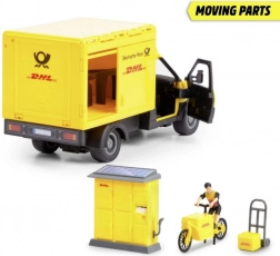 Descoperă setul realist de curierat, licențiat DHL, cu vehicul VOLVO de la Dickie Toys. Setul oferă efecte luminoase și sonore, uși care se deschid, o figurină curier, paczkomat/box pentru colete, bicicletă și accesorii pentru joacă imaginativă. Ideal pentru dezvoltarea creativității, motricității fine și a gândirii logice a copiilor.