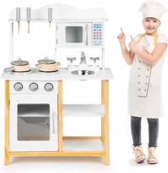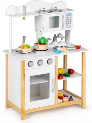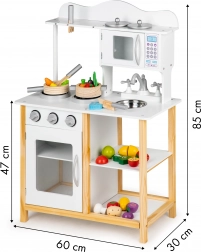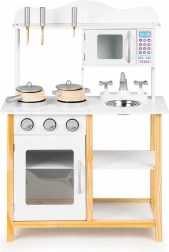 Bucătăria din lemn Ecotoys este concepută pentru copii de la 3 ani. Calitatea execuției și stabilitatea ridicată oferă un joc sigur și distractiv. Aparatele precum cuptorul și cuptorul cu microunde au uși deschizibile, iar butoanele rotative emit sunete realiste de clic.