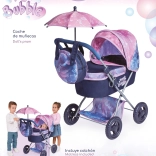 Căruciorul stilat pentru păpuși din colecția Magic Bubble impresionează prin designul său delicat în culori de curcubeu, structura pliabilă și accesoriile bogate. Include umbrelă, geantă rotundă, saltea și coș de depozitare. Datorită mânerului jos și greutății reduse, este ideal pentru fetițe mai mici de la 3 ani.