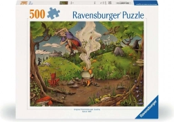 Bucurați-vă de ore de distracție și relaxare cu acest puzzle magic Ravensburger de 500 de piese, care înfățișează o vrăjitoare sărind peste un cazan într-o pădure colorată.