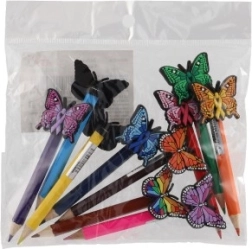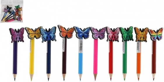 Acest set conține 10 creioane colorate, fiecare având la capăt o decorațiune sub formă de fluturaș. Decorațiunile adaugă creioanelor un element jucăuș și decorativ, făcându-le ideale pentru copii sau scriere creativă. Fluturașii multicolori aduc o notă de fantezie în scrisul și desenul dumneavoastră.
