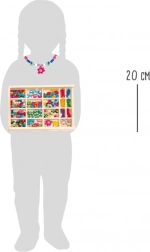 Set creativ pentru micii designeri de bijuterii: în cutia din lemn cu capac glisant transparent găsiți în total 157 de mărgele din lemn, 6 șnururi pentru înșirat și 3 pandantive. Datorită celor 19 compartimente, totul este ordonat și ușor de sortat, ceea ce susține motricitatea fină, răbdarea și creativitatea copiilor – ideal și pentru călătorii.