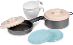Sunt incluse oală, tigaie, capace, farfurii, căni și un set de alimente și fructe – toate din plastic ușor și sigur.