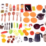 - Set de 88 piese accesorii, inclusiv oale, tigaie, ustensile, veselă, alimente și băuturi