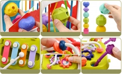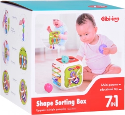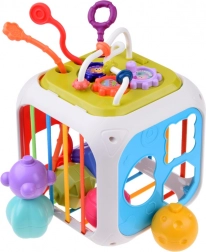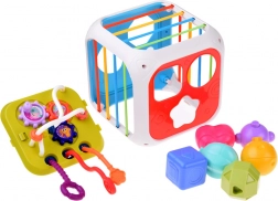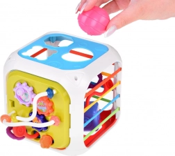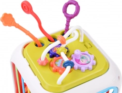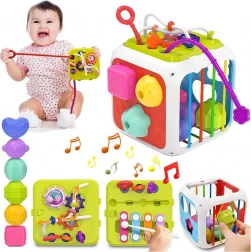 Acest cub educațional colorat, din plastic de calitate, combină activitățile preferate ale celor mici într-un singur ansamblu compact. Două fețe funcționează ca sortator de forme cu orificii diferite, iar alte trei au benzi elastice pentru împingerea pieselor și antrenarea simțului tactil. Panoul dublu adaugă clopoței și șnururi de tras cu texturi diferite pe o parte și rotițe dințate și mărgele glisante pe cealaltă.