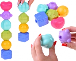 Două fețe cu orificii în forme diferite și 6 cubulețe/zornăitoare colorate îi învață pe copii să recunoască formele, antrenează coordonarea mână–ochi și susțin gândirea logică.