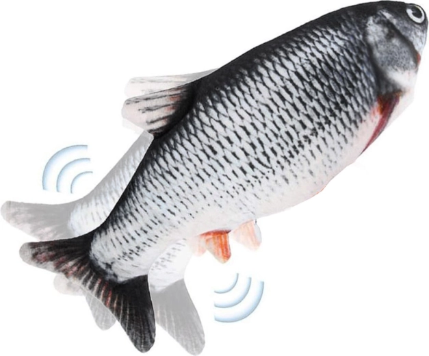 După o bătaie ușoară pe burtică, peștele prinde viață și începe să-și miște coada, simulând fidel un pește real.