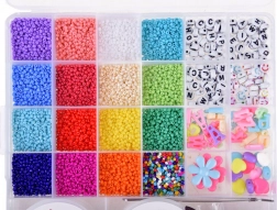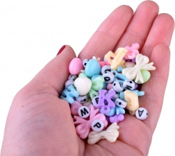 Pachetul include și ustensilele necesare – 2 bobine de sfoară elastică pentru înșirat, pensetă și foarfecă, astfel încât puteți începe să creați imediat. Datorită celor 16 culori de mărgele mici și formelor cu litere și elemente decorative veți crea cu ușurință accesorii personalizate cu nume, inițiale sau motivele preferate.