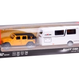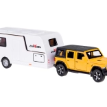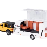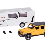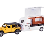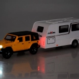 Setul cu vehicul off-road și rulotă aduce copiilor un joc realist de călătorie și camping. Modelul SUV metalic la scară 1:32 impresionează prin detalii, uși și portbagaj deschise și mai ales lumini funcționale și sunete de motor. Datorită mecanismului pull-back, mașina pornește singură înainte după tensionare.