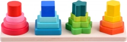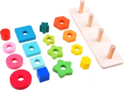 Jocul educativ din lemn cu patru stâlpi oferă copiilor distracție inteligentă: sortează și așază forme (cercuri, pătrate, stele etc.), învață culorile și combină după model sau propria imaginație. Datorită finisajului neted și culorilor saturate, jocul este plăcut la atingere și invită la descoperiri continue.